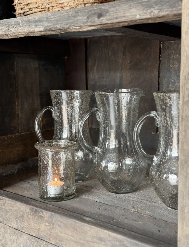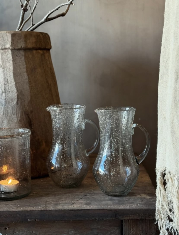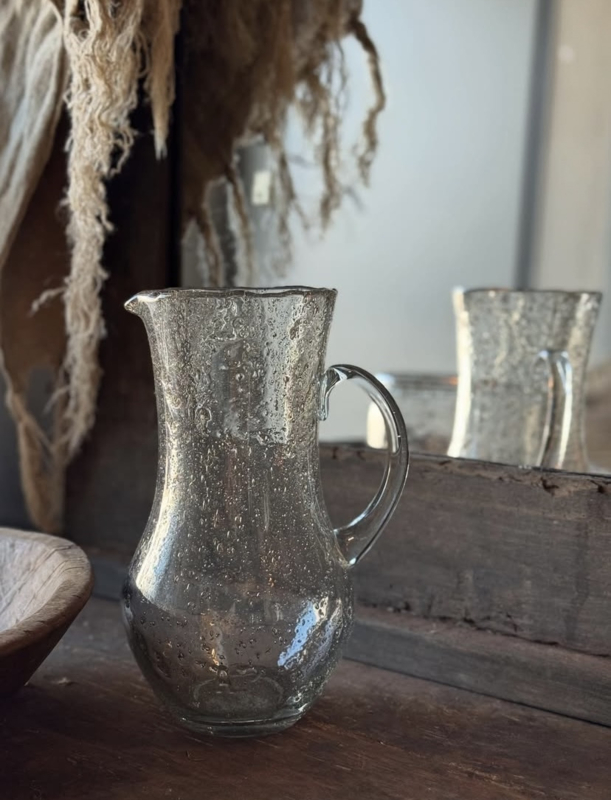 Het glas is volledig mondgeblazen en daardoor is er geen 1 kan hetzelfde, de ene waterkan heeft wat meer metalen schilfers dan de andere kan, dit maakt het een uniek item.